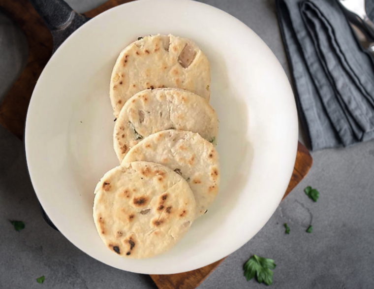 Alles gut durchkneten, den Teig ausrollen und runde Formen ausstechen. In einer erhitzen Pfanne beidseitig ohne Öl backen.
