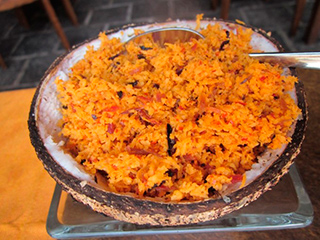 Die Kokosmilch wird dann mit dem Kokosöl erwärmt und danach werden alle Gewürze hinzugefügt. Nun röstet man die Mandlen kurz in einer Pfanne ohne Fett an. Die gewürzte Flüssigkeit wird nun über die Bananen geleert und dann wird alles mit Mandeln und Rosinen bestreut.